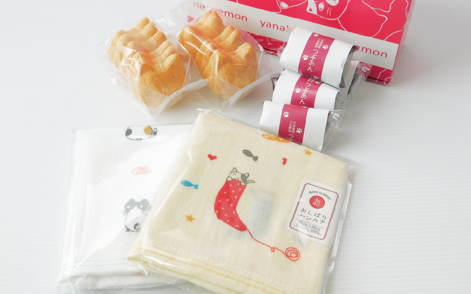 薄手で柔らかいコットン100%のガーゼハンカチ2枚と猫もなかのセットです。