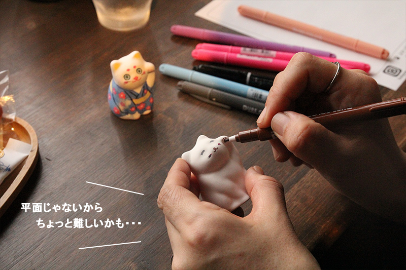 顏から描いても、柄から描いてもOK。水性ペンなので塗れた手で触れるとせっかく描いた絵が消えてしまうのでご注意ください。